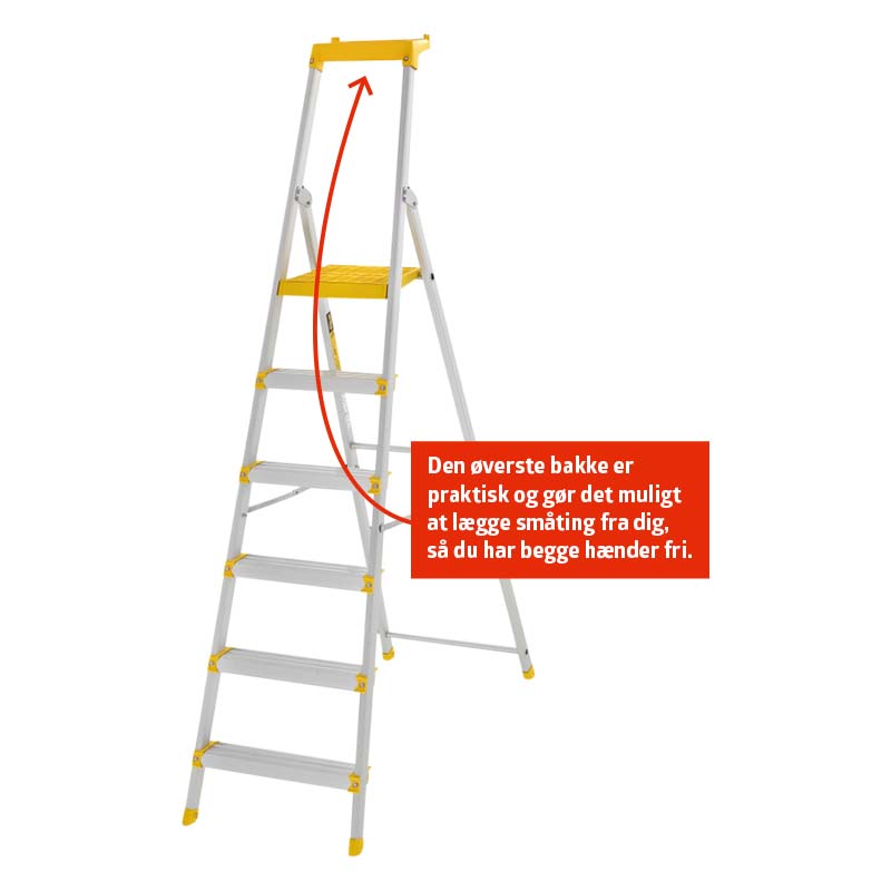 har en solid platform, hvor du enten kan placere malerspanden eller dig selv. Mange modeller har desuden en smart bakke monteret på den øverste bøjle, hvor du nemt kan lægge skruer og håndværktøj fra dig.