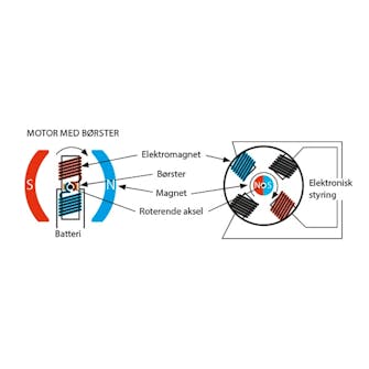 I en gammeldags motor med børster sidder elektromagneterne på den roterende aksel i midten og drejer med rundt. Børsterne bruges til at skabe forbindelse fra batteriet til den roterende aksel.