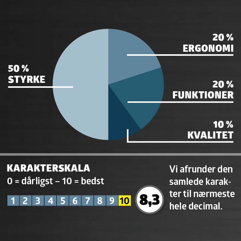 Slagskruemaskinerne bliver testet og får karakterer i disse fire kategorier; styrke, ergonomi, funktioner og kvalitet.