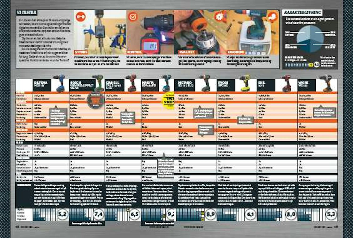 Bore-/skruemaskinen skal først og fremmest kunne bore og skrue. Derfor måler vi styrken og tester, om deltagerne kan skrue en stor, krævende karmskrue i.