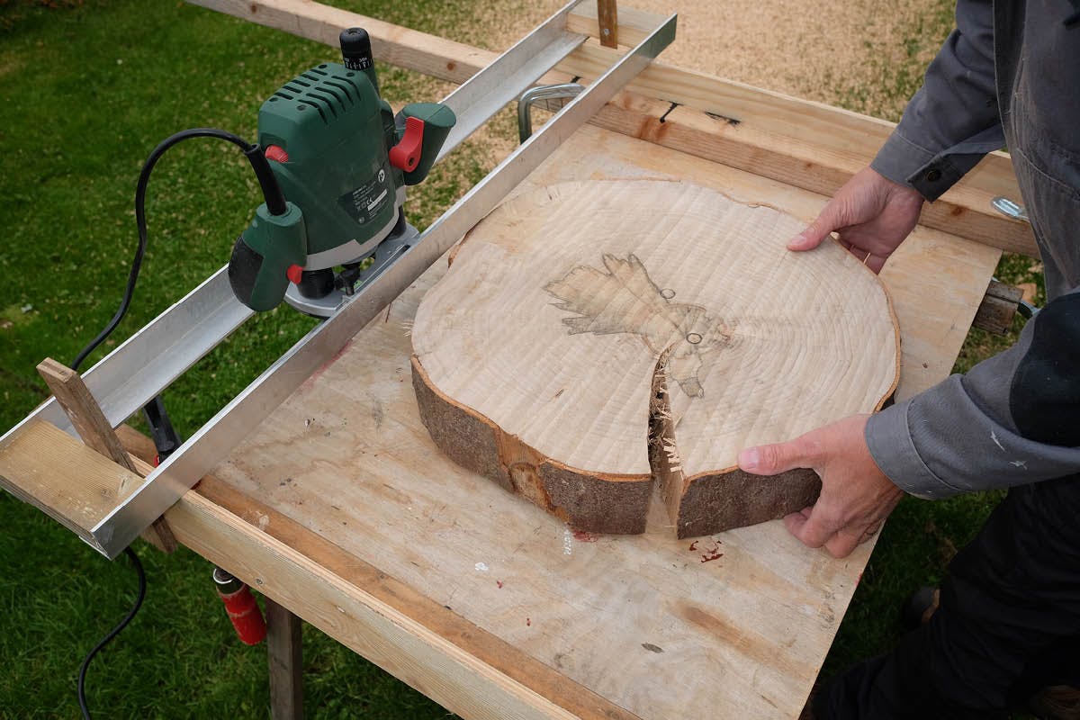Tjek, at notjernet sidder i den rigtige dybde. Fræs et prøvespor i træet, så du sikrer dig, at maskinen er rigtigt indstillet. Er træstykket lidt ujævnt, kan du klodse op, så det ligger stabilt og så lige som muligt.