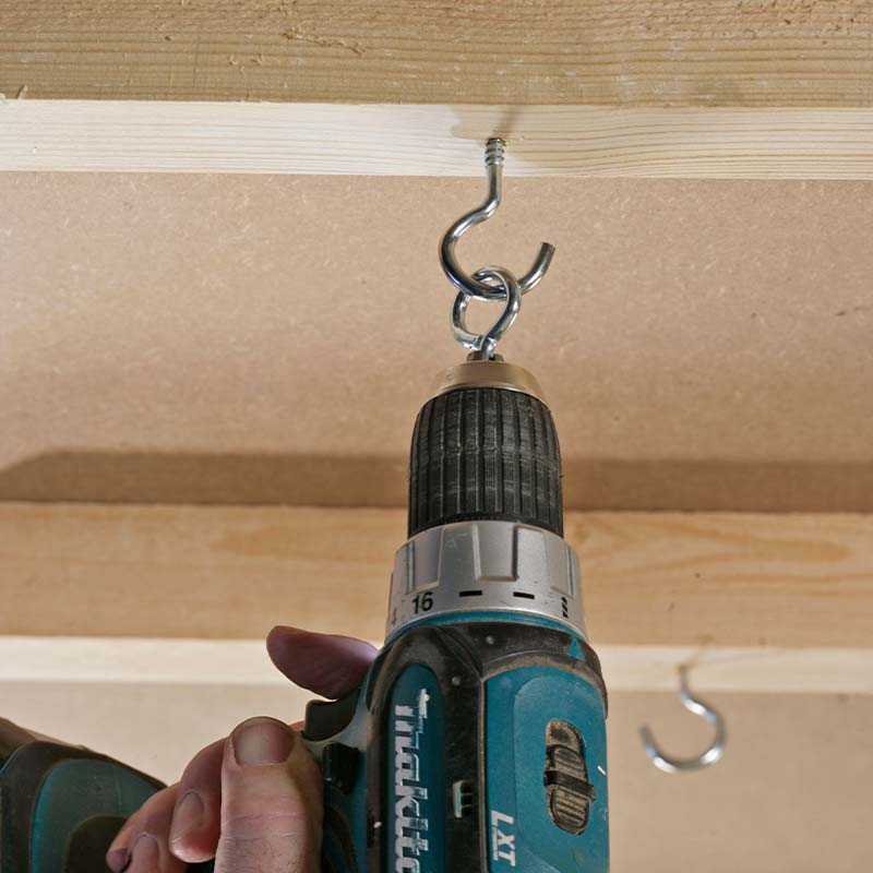 Du behøver ikke vride hånden af led for at skrue kroge i loftsbjælkerne. Sæt i stedet en øsken fast i skruemaskinens bitholder, og brug øskenen til at skrue krogene fast i loftet.