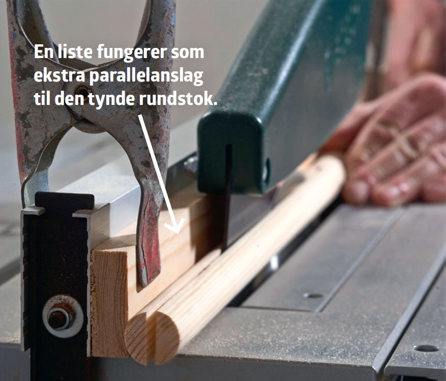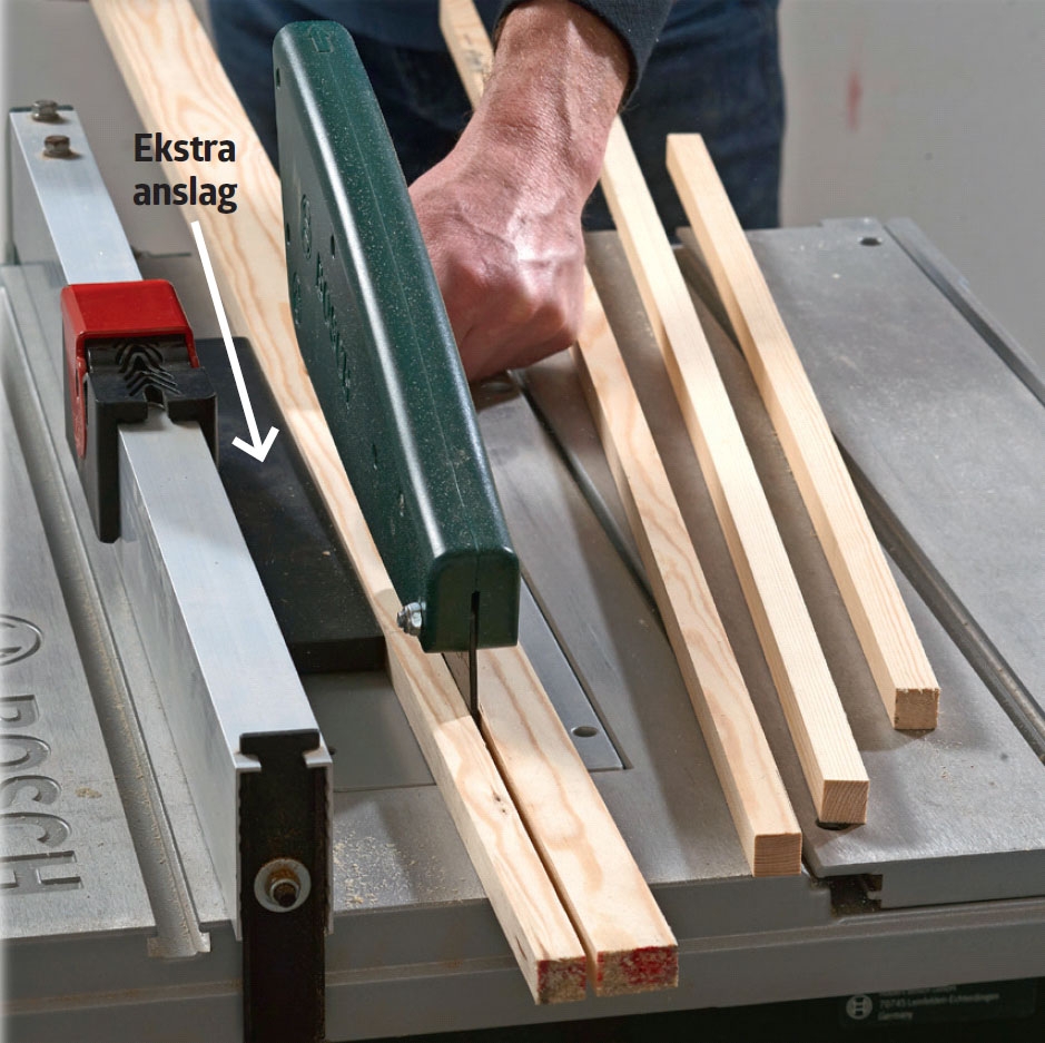 Det er uhyre praktisk at kunne skræddersy sine egne lister, og der er gode penge at spare ved selv at skære dem op af brædder i stedet for at indkøbe færdige i byggemarkedet. Læg mærke til det lille ekstra parallelanslag, der gør det muligt at save helt tæt på klingen, uden at sikkerhedsskærmen kommer i vejen. Alternativt kan du spænde en liste fast.
