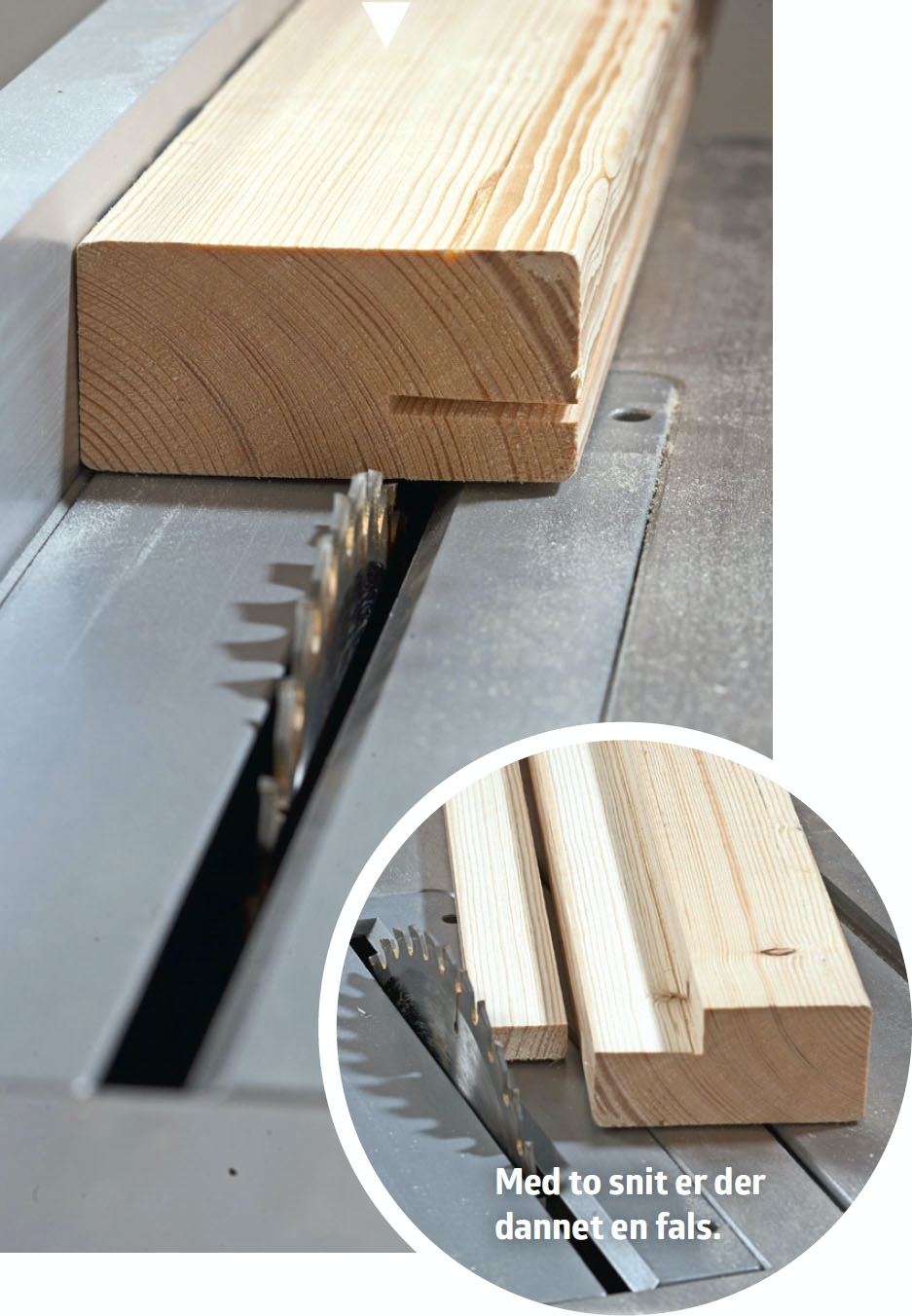 False til vinduesrammer eller andet klarer bordrundsaven i to hurtige arbejdsgange, og der er virkelig penge at spare. Her er falsens bredde savet først.