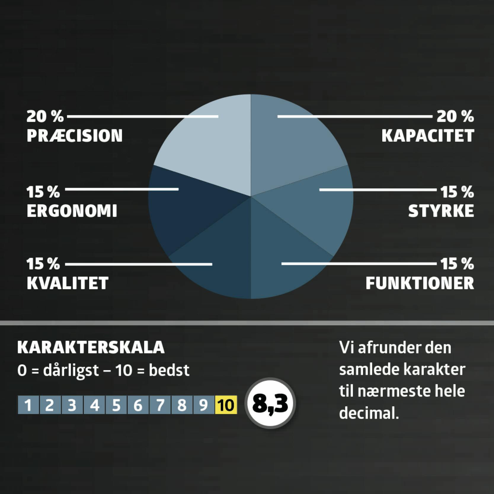 Savene bliver testet og får karakterer i disse seks kategorier; præcision, kapacitet, styrke, funktioner, kvalitet og ergonomi.