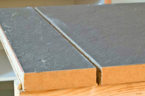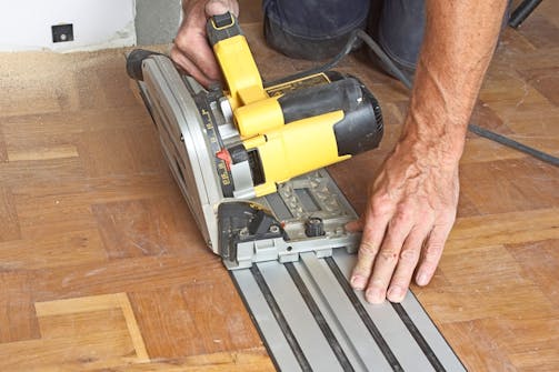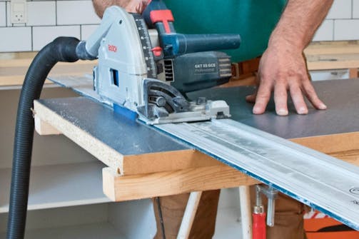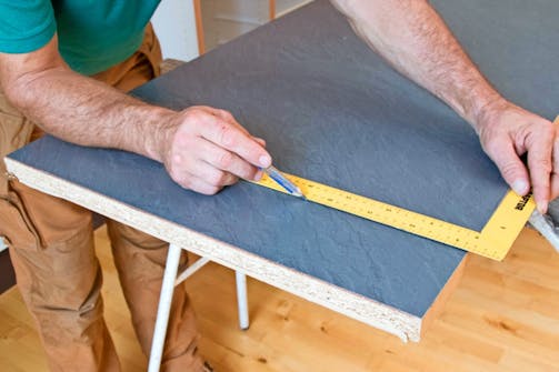1. Laminat er hårdt og vil flosse, hvis man saver et snit i ét hug. Med dyksaven kan man lave et perfekt snit uden flosser. Først måles præcist op.