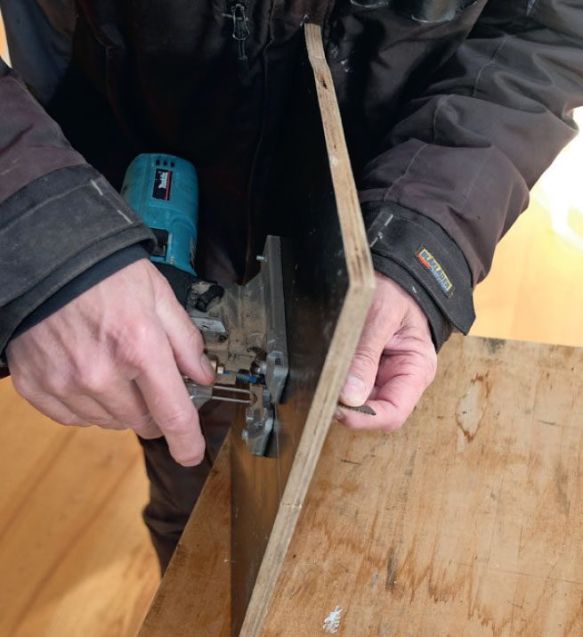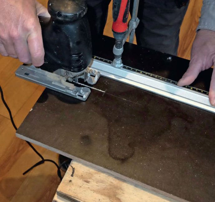 Sav en rille i krydsfineren. Sørg for at save så langt ind, at savens sål er dækket af plade hele vejen rundt.