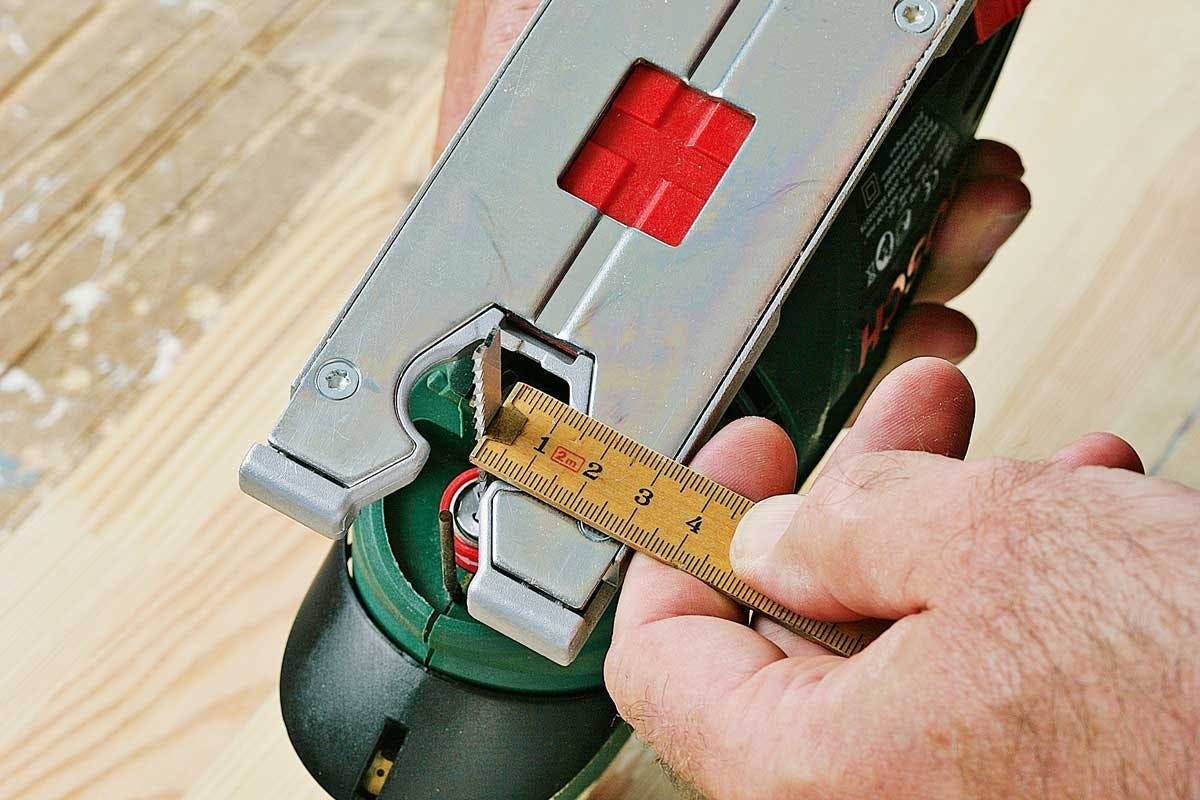 For at kunne save langs en føringsskinne skal du først måle afstanden mellem klingen og kanten af fodpladen.