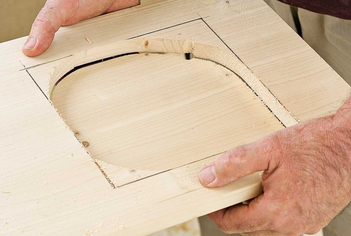 Sav i en blød bue ud til stregen, og følg stregen hen mod hjørnet. Sav helt ind i hjørnet, sluk stiksaven, og træk den 5 cm baglæns, før du saver videre i et blødt sving forbi hjørnet.