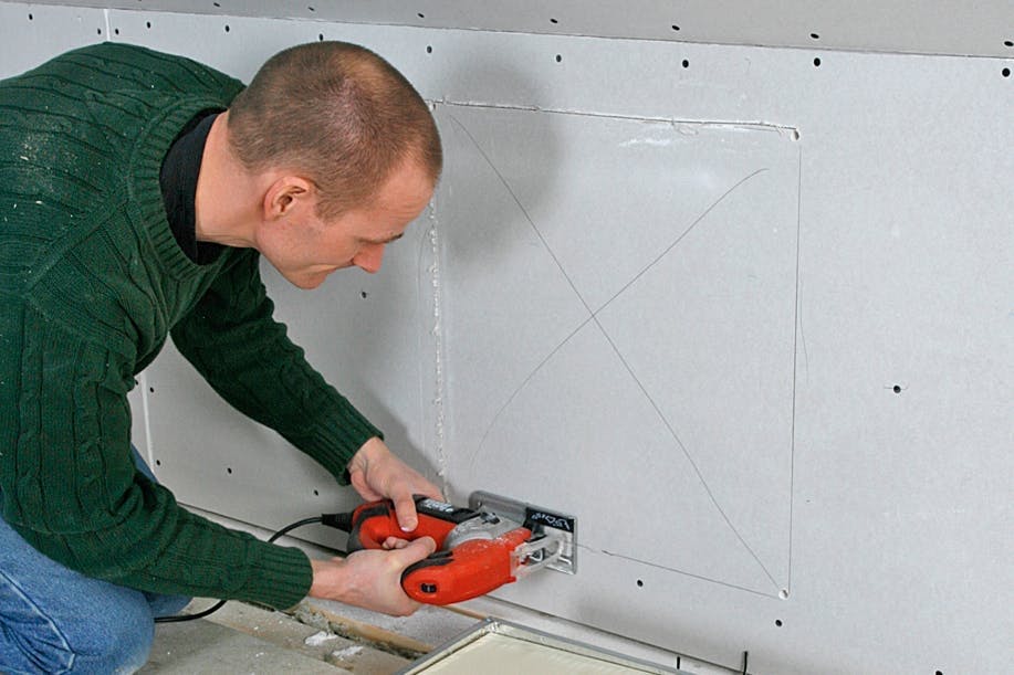Start med at bore et hul i det felt, der skal saves ud – et par centimenter fra opstregningen. Hullet skal være stort nok til, at savklingen kan gå ubesværet ned igennem.