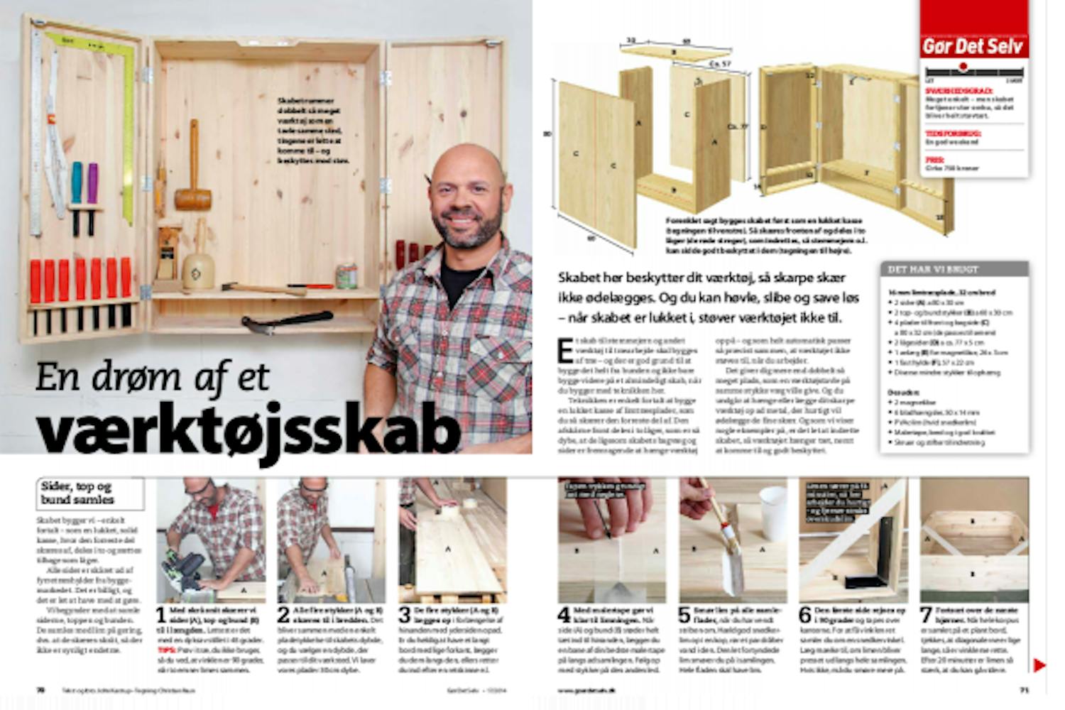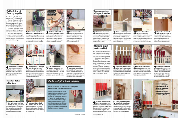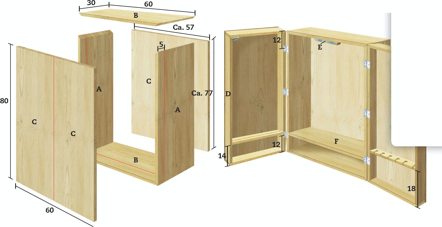 Skabet bygger vi - enkelt fortalt - som en lukket, solid kasse, hvor den forreste del skæres af, deles i to og sættes tilbage som låger.