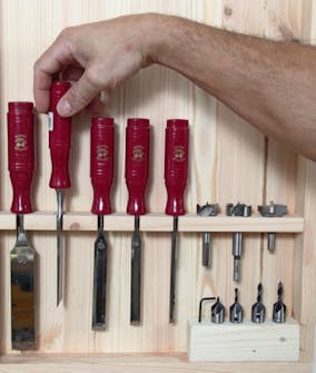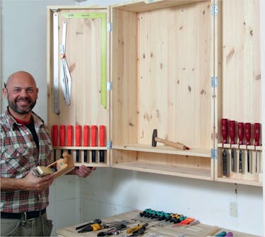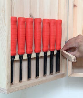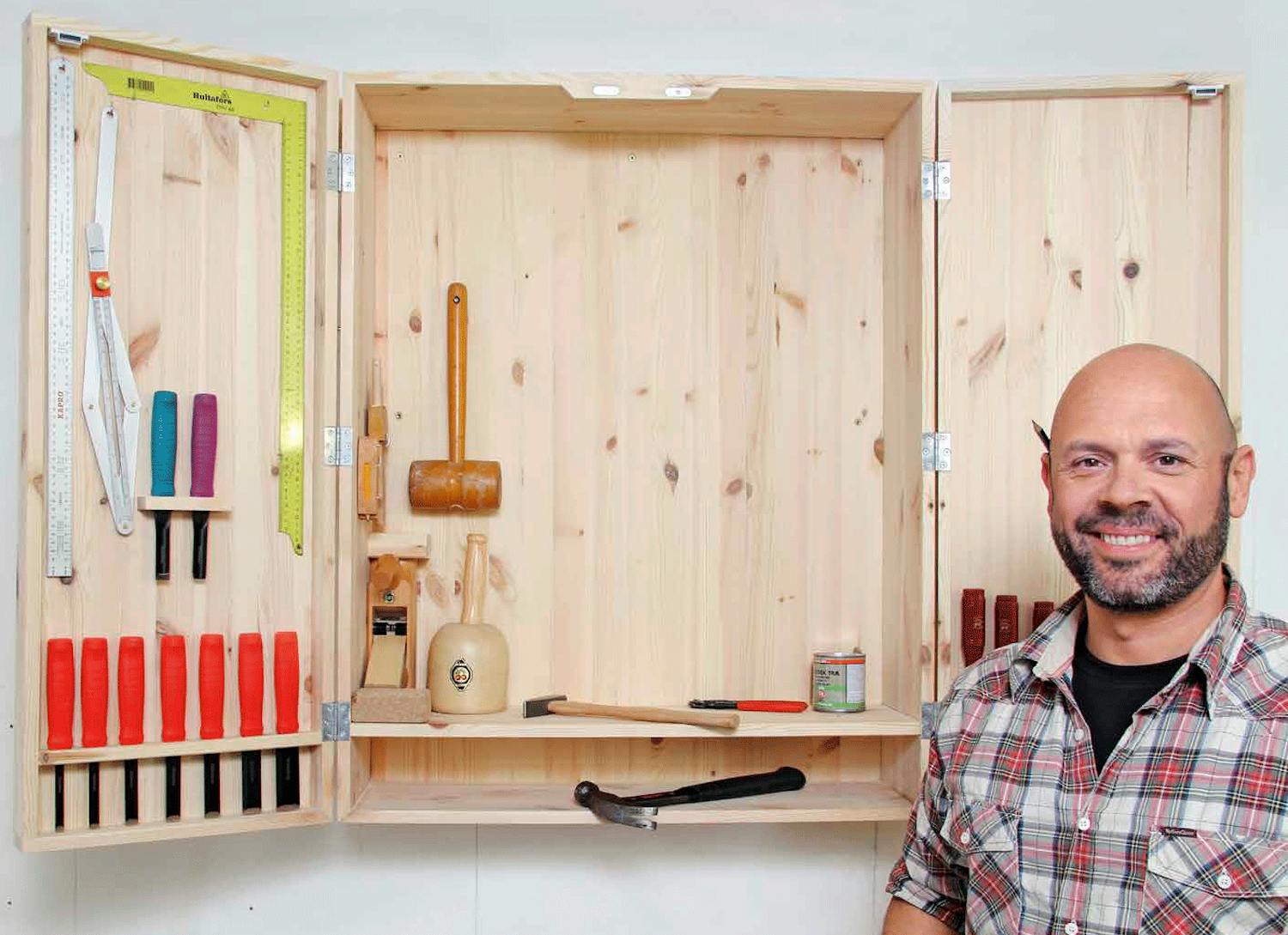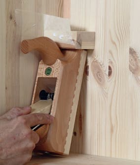 Også pudshøvlen giver vi en beskyttet plads i skabet. Som stemmejernene skal den holdes fri af metal. Med et par små flade lister kan du let give den et lille modhold, så den står trygt op ad bagvæggen.