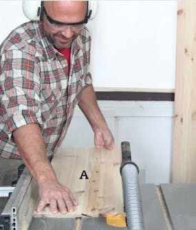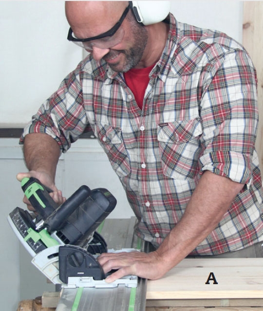 Med skrå snit skærer vi sider (A), top og bund (B) til i længden. Lettest er det med en dyksav stillet i 45 grader.