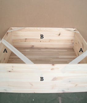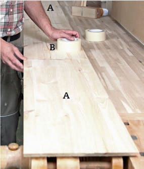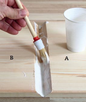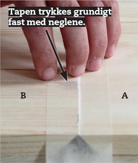 Med malertape gør vi klar til limningen. Når side (A) og bund (B) støder helt tæt ind til hinanden, lægger du en bane af din bedste malertape på langs ad samlingen. Følg op med stykker på den anden led.