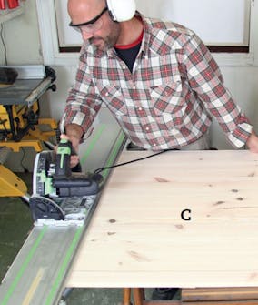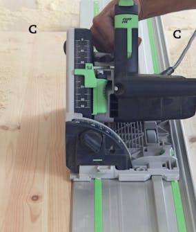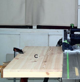 Frontpladen (C) skæres til efter opstregningen. Med føringsskinne og dyksav bliver det præcist og er let at skære, selvom der måske kun fjernes få millimeter.