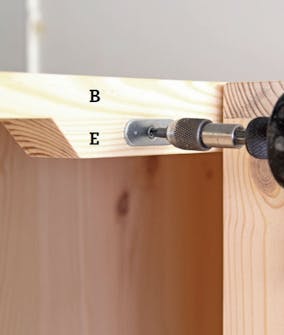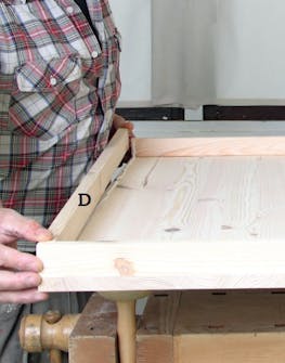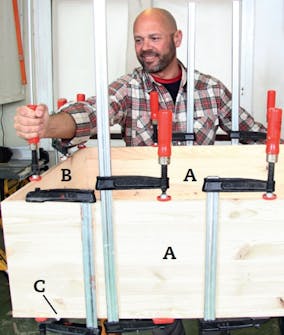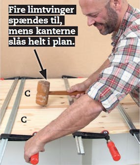 Frontpladen (C) limes på korpus (A og B). Smør snedkerlim på forkanterne, læg korpus oven på frontpladen, og spænd til med skruetvinger. Du skal sikre et plant underlag, hvor tvingerne finder plads.