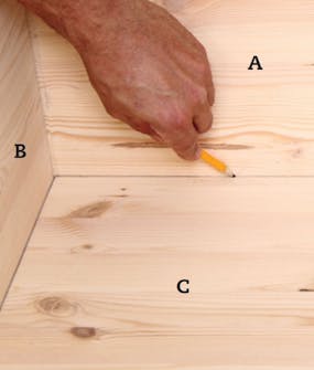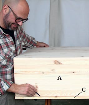 Fronten skæres til. Placér korpus oven på de sammenlimede plader, som skal blive til fronten (C). Tjek med diagonalmål, at korpus ligger i vinkel. Tegn op hele vejen rundt om kassen.