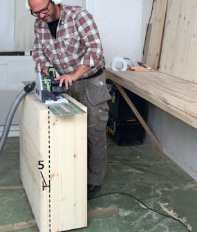 Alle fire stykker (A og B) skæres til i bredden. Det bliver sammen med en enkelt pladetykkelse til skabets dybde, og du vælger en dybde, der passer til dit værksted. Vi laver vores plader 30 cm dybe.