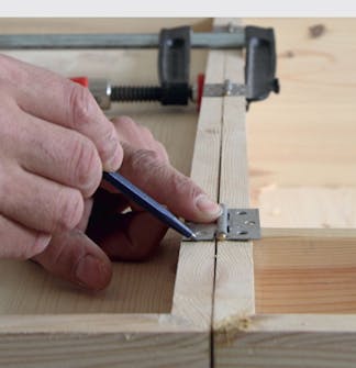 Mærk op til hængsler. Lågerne skal hængsles på rammen. Spænd en låge op på rammen, hvor den skal sidde, så den flugter. Tegn op til tre bladhængsler hhv. 12 cm fra top og bund og i midten.