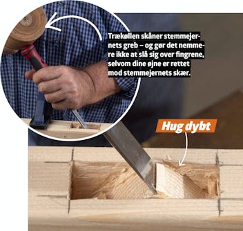 1. Præcis afgrænsning Hvis du fx skal stemme ud til et hængsel, skal det gøres præcist. Derfor skal du først strege præcist op, og herefter stikker du området af: Placér stemmejernet på stregen med den plane side udad. Slå jernet få millimeter ned. Gør det hele vejen rundt langs stregen.