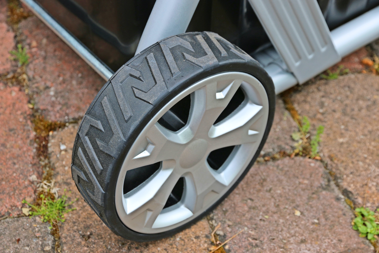 HJUL. Store hjul gør det nemmere at flytte maskinen. Gummihjul står bedre fast end hjul af hård plast.