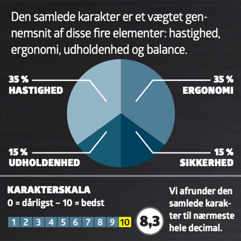 Den samlede karakter er et vægtet gennemsnit af disse fire elementer: hastighed, ergonomi, udholdenhed og balance.