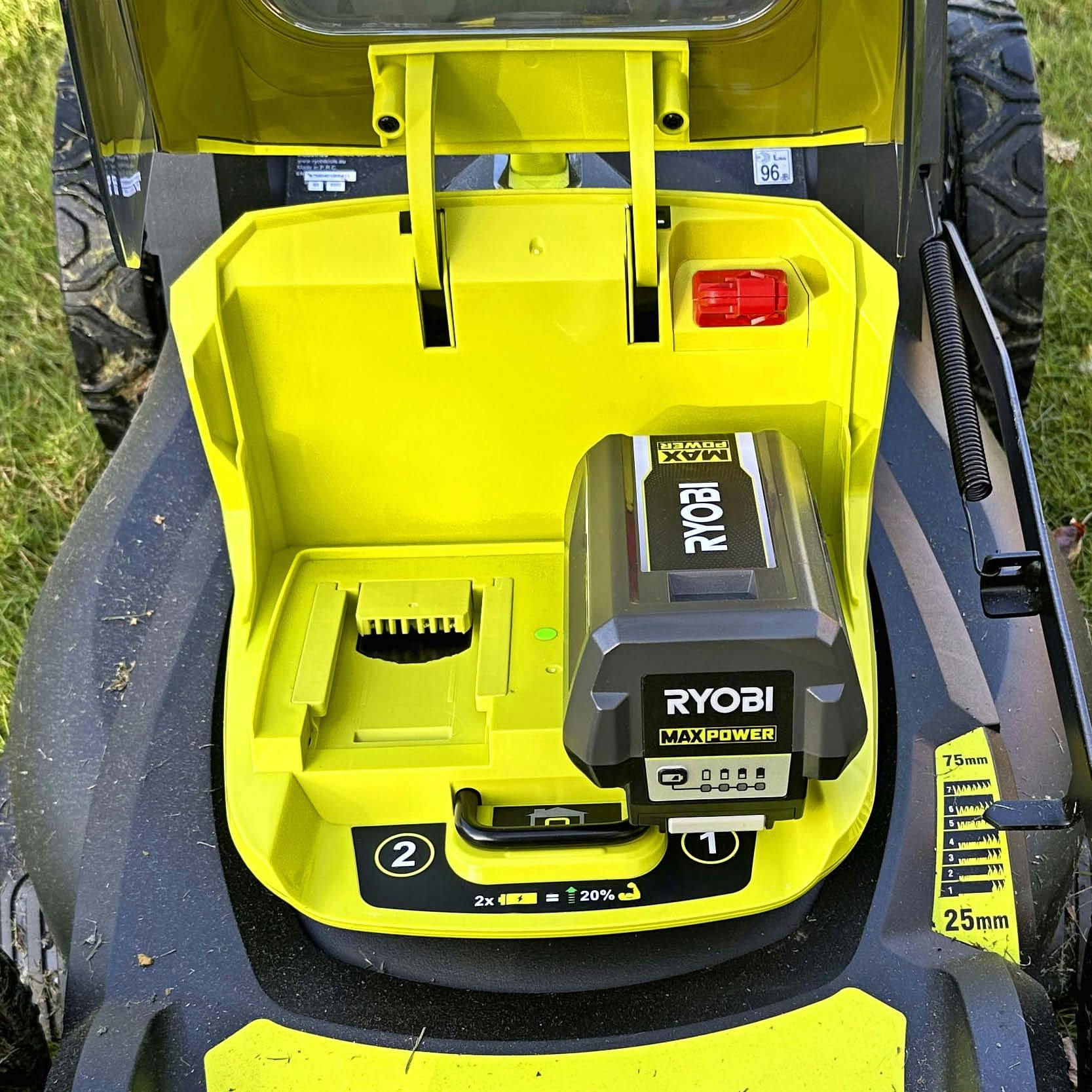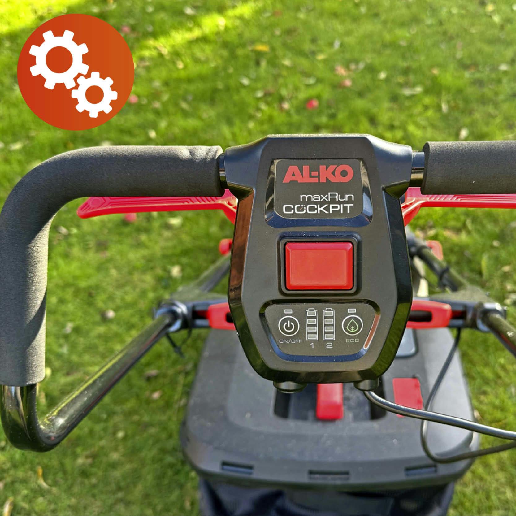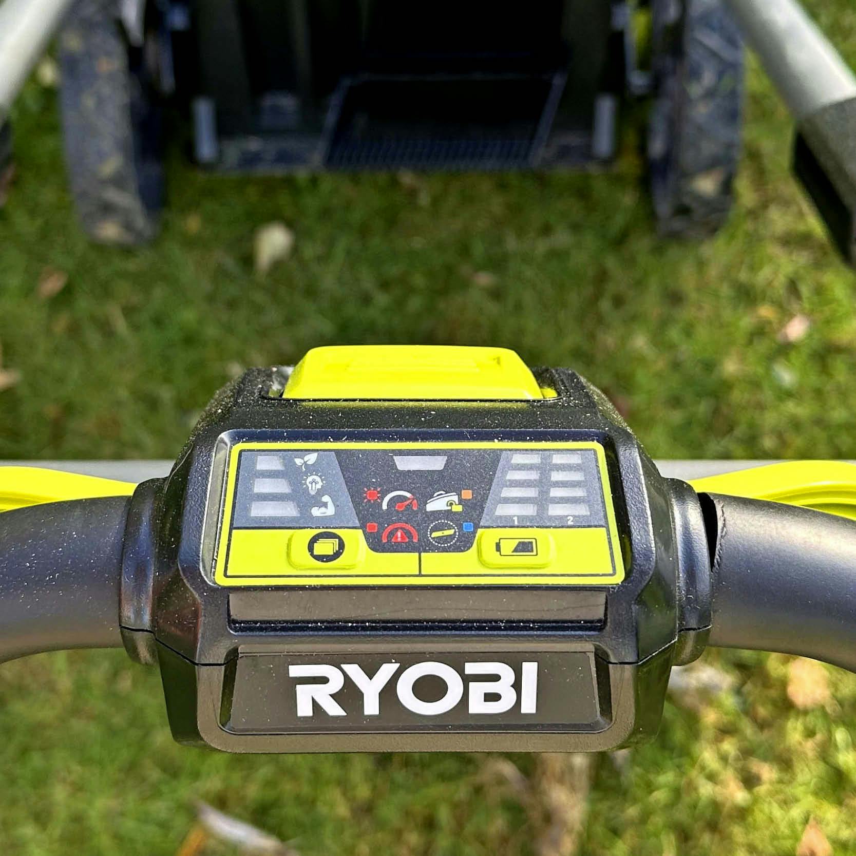 Ryobi udmærker sig også på de mange funktioner. Man kan bl.a. vælge mellem “Eco”, som forlænger driftstiden, “Smart”, som tilpasser klipningen efter forholdene, og “Power”, som øger ydeevnen. Betjeningspanelet viser desuden, hvor meget strøm der er tilbage på batteriet, om maskinen bliver for hårdt belastet, eller om klingen skal kontrolleres eller skiftes. Det viser også, om enten græsopsamleren eller bioklipproppen ikke er monteret ordentligt.