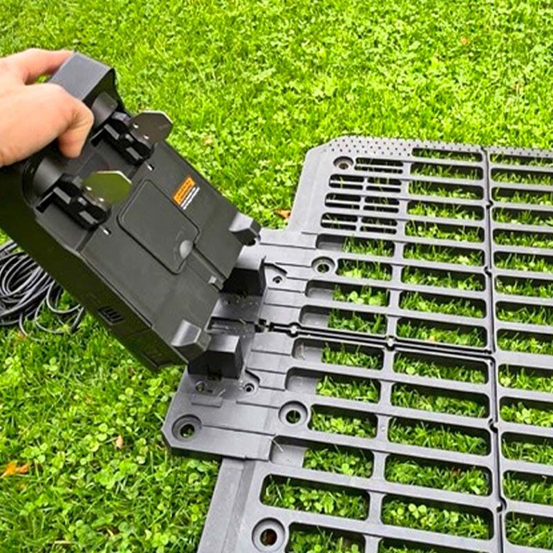 Worx byder også på uventede plusser. Fx er ladestationens plade perforeret, så græsset under ikke bliver kvalt. Og så kan den elektriske del af ladestationen kobles af pladen og tages indenfor over vinteren, mens pladen bliver liggende.