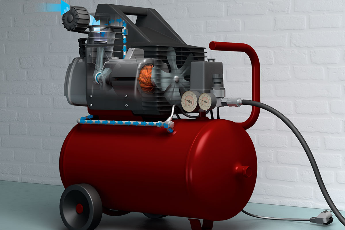Stemplet i cylinderen er hjertet i kompressoren. Det suger luft udefra ind gennem indsugningsfilteret, når det trækkes ned i sin cylinder, og presser luften ud gennem røret og ned i tanken, når det trykkes op. Det er de små membranventiler i cylinderens top, der åbner og lukker, så luften hver gang hentes udefra og fra cylinderen presses ned i tanken, hvor trykket derfor øges.
