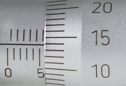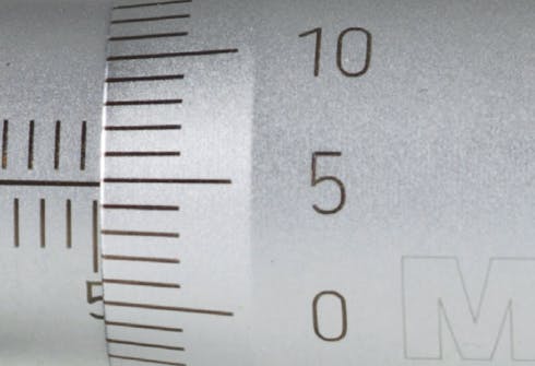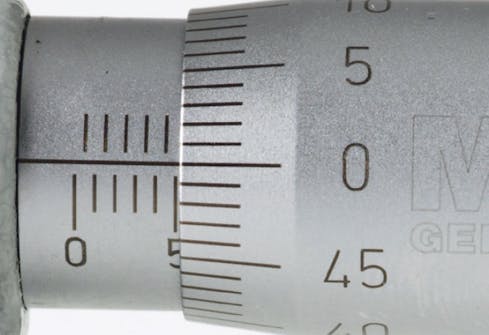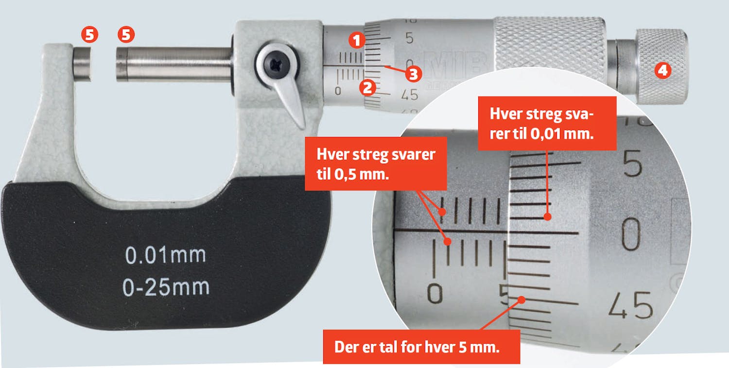 Eksempel: Måleskinnen er skruet ud til markeringen 5 på skalatromlen. Der er altså 5 mm imellem kæberne. Måleskinnen viser 0 ud for referencelinjen på skalatromlen. 5 + 0,0 = 5 mm.