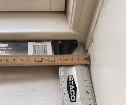 Skævheder, fx i en lysning, måles nemmest ved at holde en vinkel som vist og så måle afstanden mellem vinkel og væg.