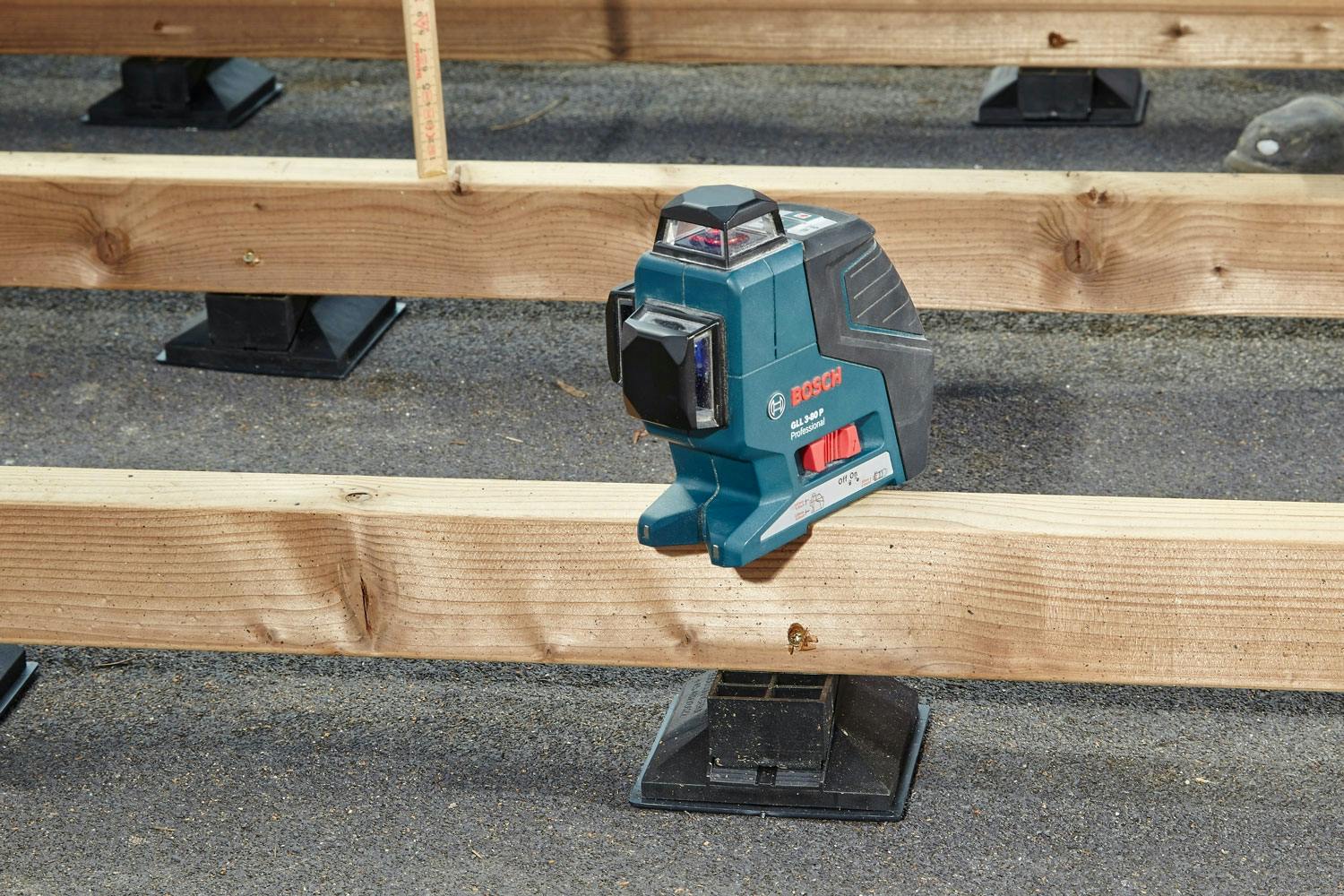 Straks din krydslinjelaser er stillet op og er faldet til ro, har du et vandret plan. Så afgør du, hvor fx oversiden af strøerne til en terrasse skal ligge i forhold til laserlyset, og den afstand kan du til hver en tid måle ned fra lyset. Du kan også ud fra laserstrålen spænde snore ud, så de danner et nyt måleplan, som ikke er afhængigt af laseren.