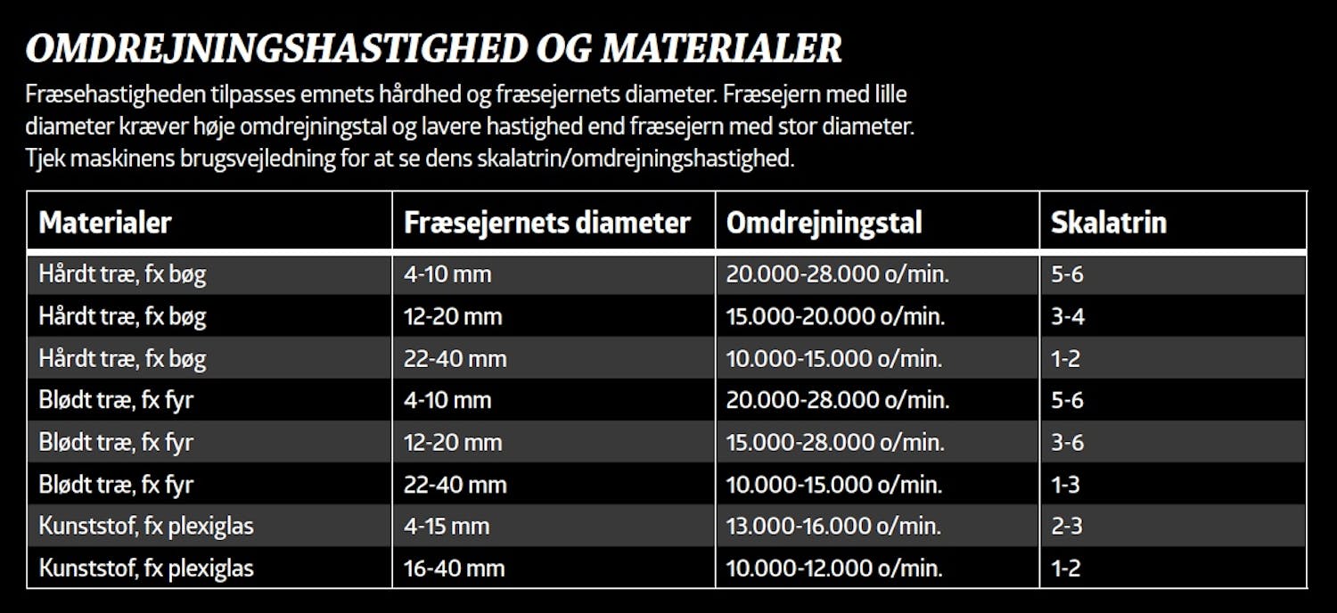VARIABEL HASTIGHED er optimalt. Giver mulighed for at vælge omdrejninger, der passer til fræsejern og materiale. Findes ikke på alle maskiner.