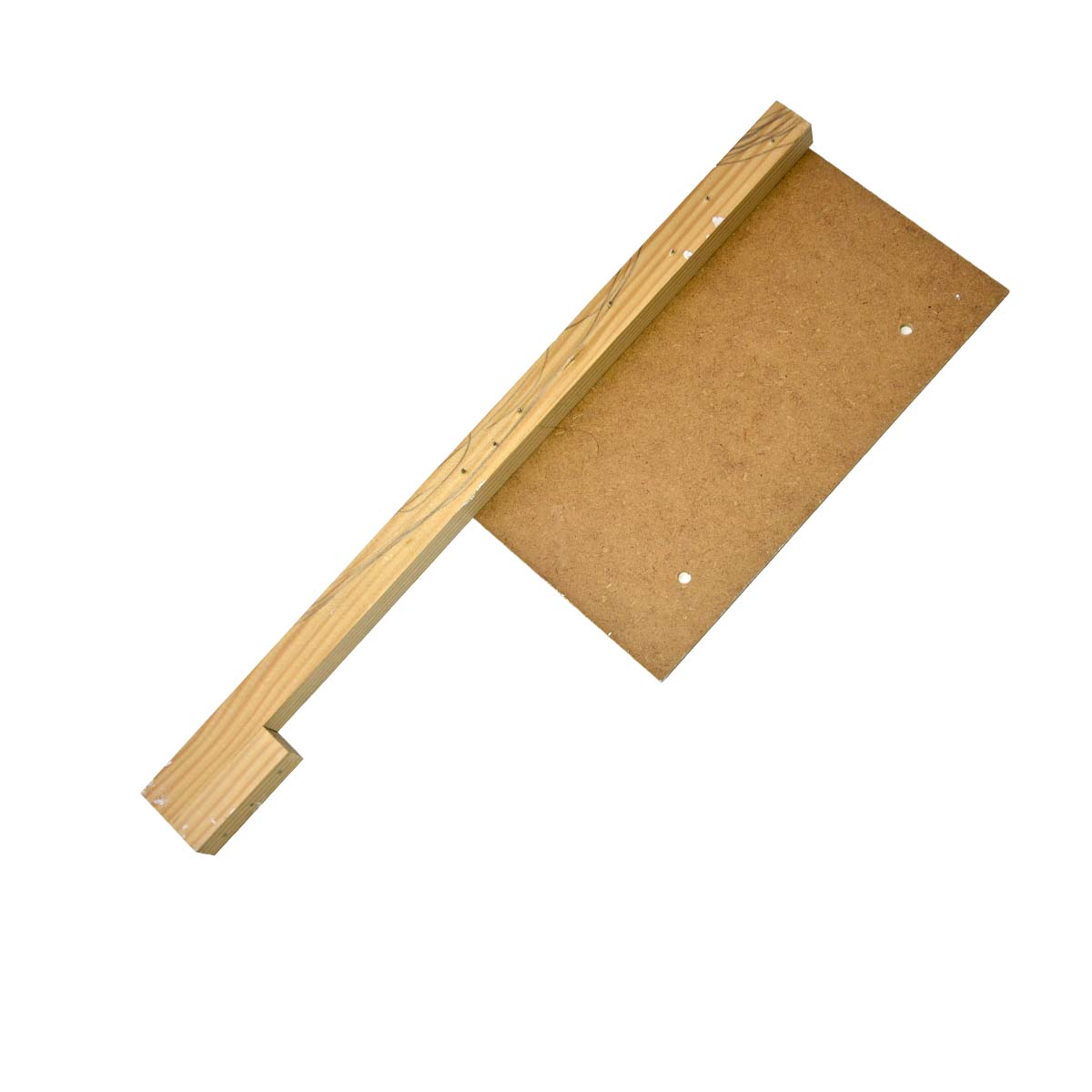 Denne afstandsklods er nem at få fat i, og så falder den ikke konstant ned mellem brædderne. Den er fremstillet af krydsfiner, som har samme tykkelse, som der ønskes mellem brædderne. Derudover er der lavet et fingerhul på 15 mm, og så er der monteret en dyvel på tværs.