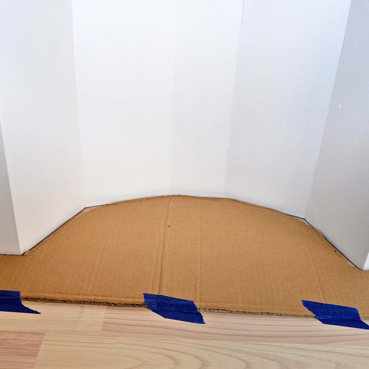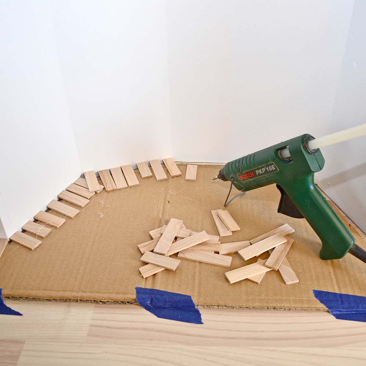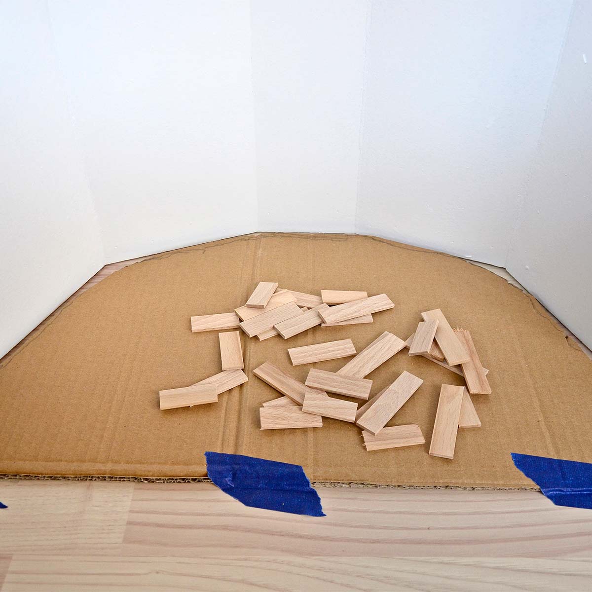 Klip et stykke pap groft til, så det kan komme ind i hjørnet, der skal mærkes op, og sæt det så fast med malertape. Klip eller skær en bunke listestumper, og stød dem helt ind mod væggen, inden de limes fast. Formen på det indvendige hjørne kan nu nemt overføres til et gulvbræt eller lignende.