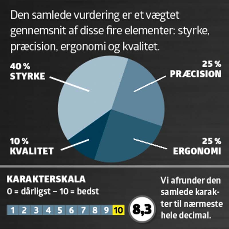 Den samlede vurdering er et vægtet gennemsnit af disse fire elementer: styrke, præcision, ergonomi og kvalitet.