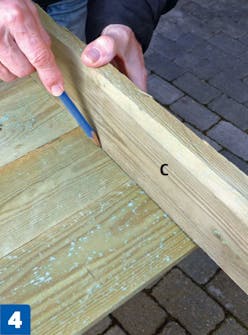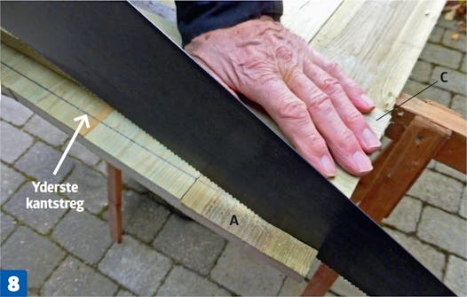 Læg samlebrættet (C) op på de fire sidebrædder (A), og afsæt dets længde med en blyant. Dernæst saver du samlebrættet, så det får den rette længde.