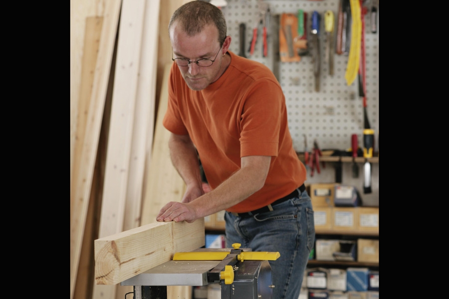 Når du arbejder med elværktøj, skal du altid passe på, at hænder og fingre ikke kan komme i klemme. En tykkelseshøvl er udstyret med skarpe knive, som let høvler et bræt til den rette tykkelse, men som også sagtens kan koste en finger. Brug derfor en skubbepind til at styre træet sikkert gennem høvlen.