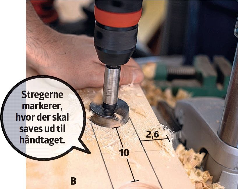 Bor ud i pladen (B) til et håndtag (M), der skal være på midten af pladen foroven. De to huller bores med et 40mm-forstnerbor og placeres 2,6 cm fra øverste kant med en afstand på 10 cm.