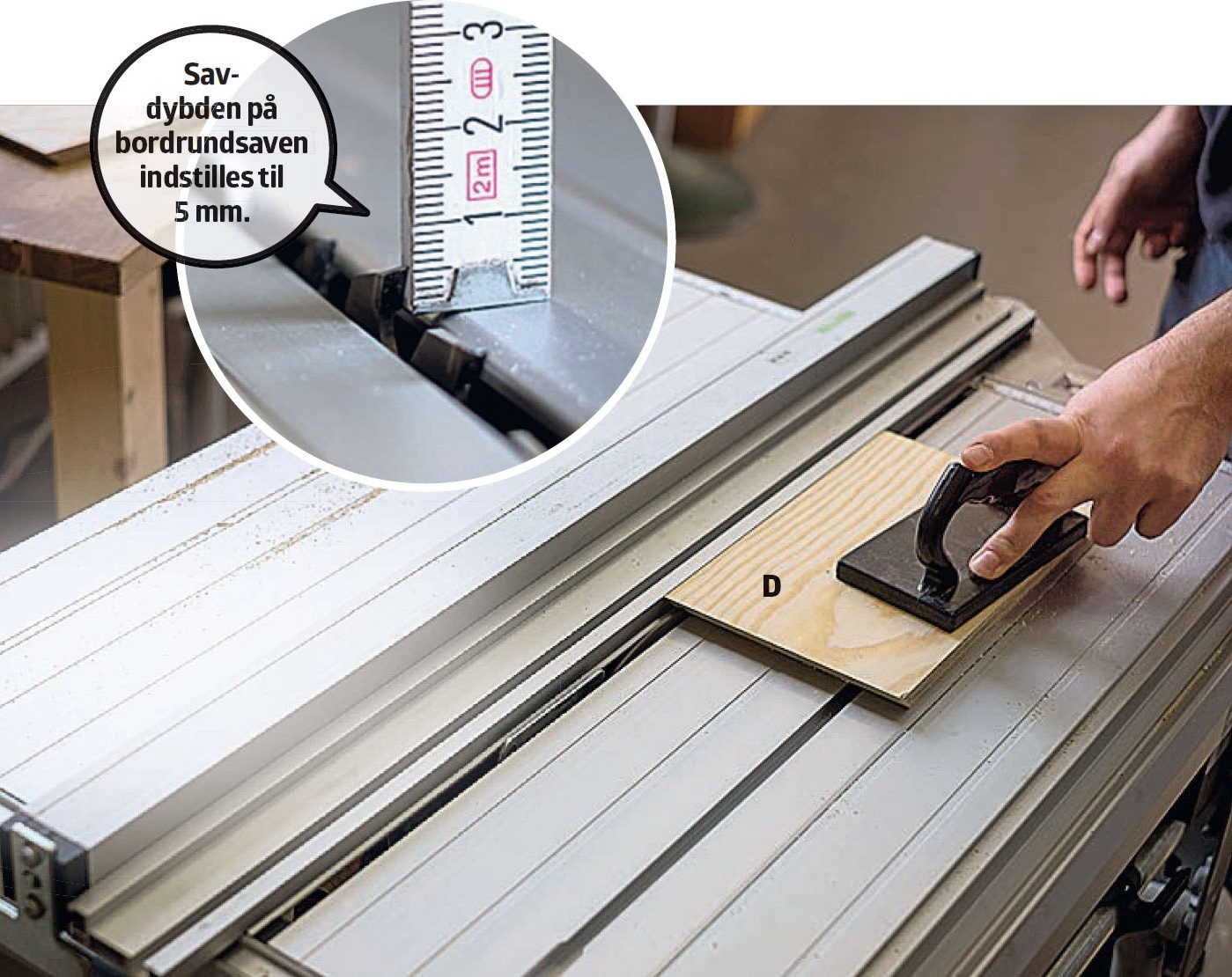 Den første rille saves 5 mm fra kanten. Det letteste er at indstille afstanden på saven og så save den første rille på alle dele.