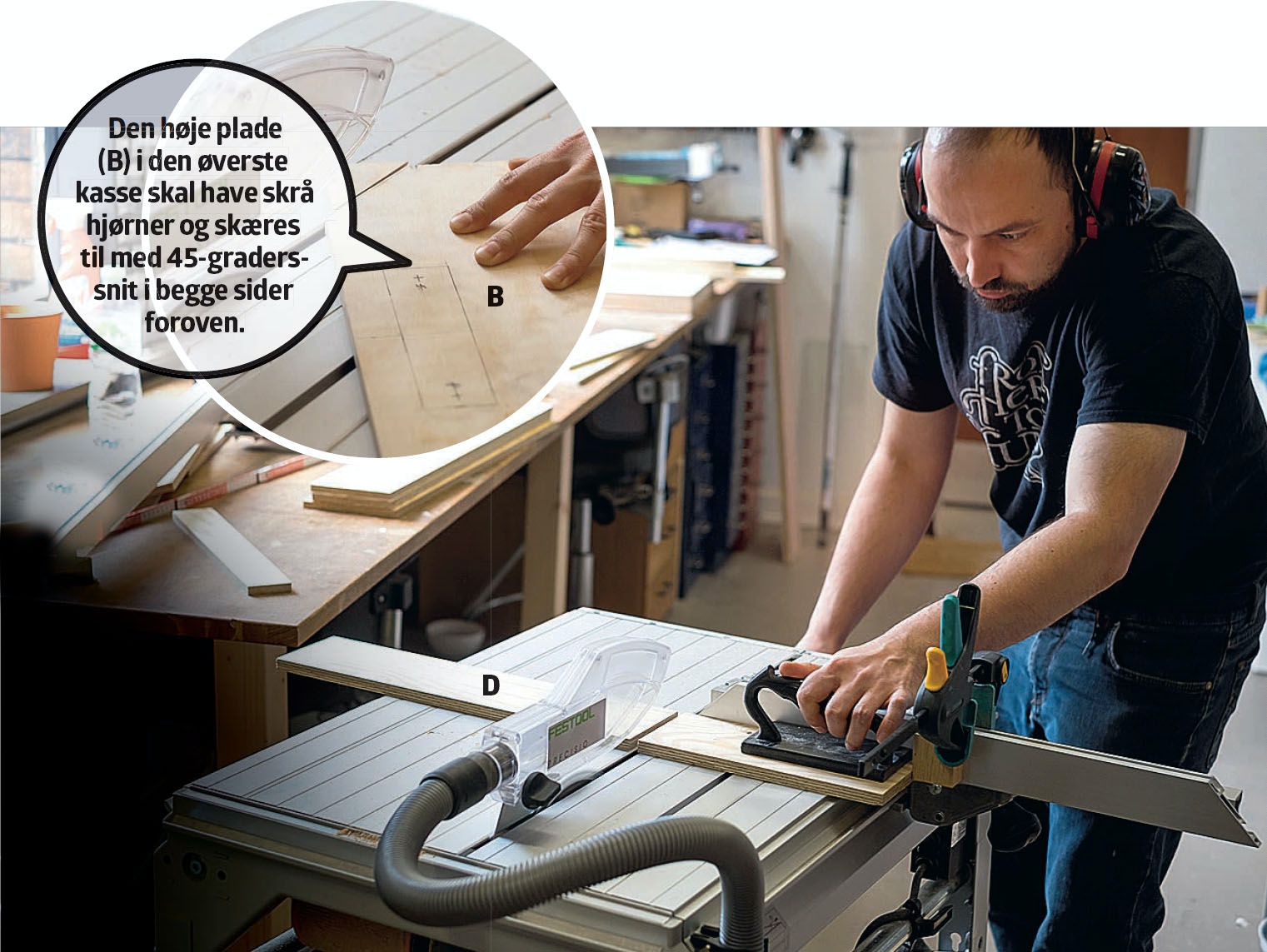 Sav delene til. Sidestykkerne (C, D, E, F, H og J) saves til med et skråt 45-graders snit i enderne, så kasserne får flotte smigsamlinger i hjørnerne.
