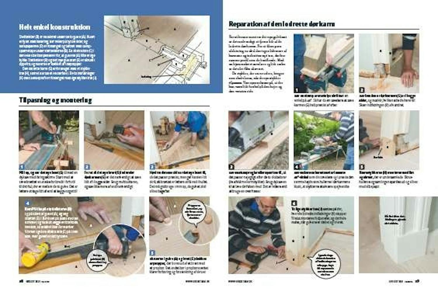 For at kunne montere det nye gulvbræt er det nødvendigt at fjerne lidt af de lodrette dørkarme. For at få en pæn afslutning nu skal der tages lidt mere af karmene og indsættes nyt træ, der har samme profil som de bestående. Med en hjemmelavet savelære og lidt omhu er det slet ikke så svært.