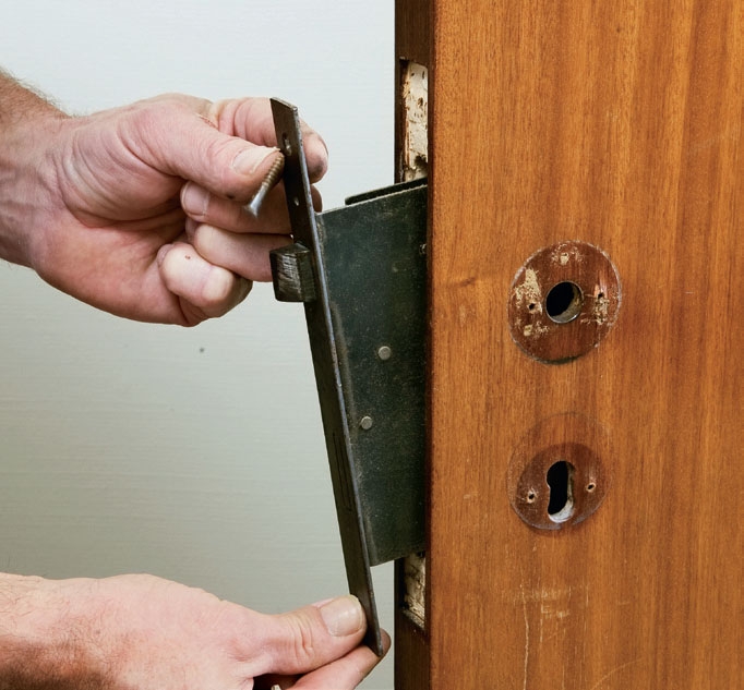 Start med at afmontere håndtag, rosetter og låsekasse. Håndtaget på den ene side af døren løsnes og trækkes ud. Herefter kan det andet håndtag og hele låsekassen afmonteres.