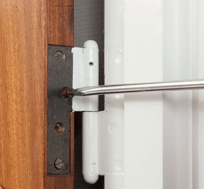 Dørbladet kan normalt rettes ind på plads ved at bukke hængslerne en smule, hvis døren sidder skævt. Det gør du pænt og sikkert med hængsel bukkeren, som fås i byggemarkedet. Den sættes ned over hængslet, som så vrides, til dørbladet passer.