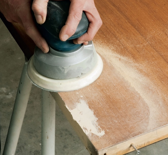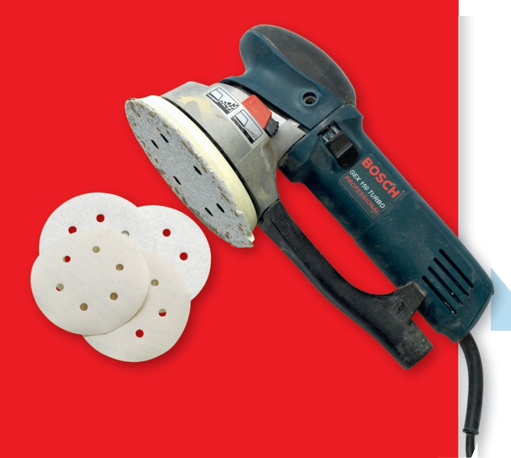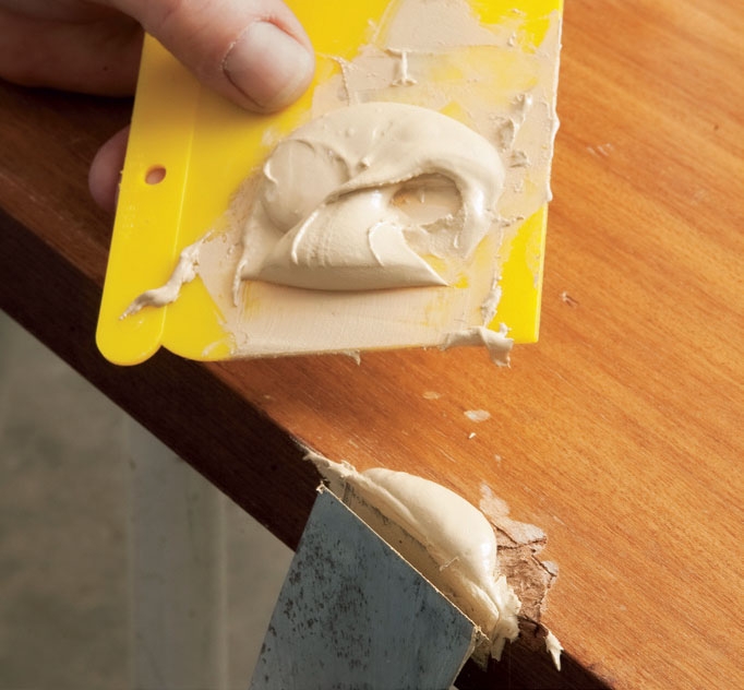 Alle små huller, sprækker, hak og fordybninger fylder du op med letvægtsfiller, snedkerispartelmasse eller anden hurtigtørrende spartelmasse, der er til at slibe på - altså ikke blød akrylfuge. Større huller og hak klares med en tokomponent reparationsmasse som “Kemisk træ” fra Plastic Padding. Den tørrer på få minutter, selv i tykke lag, og så kan du hurtigt komme i gang med at slibe.