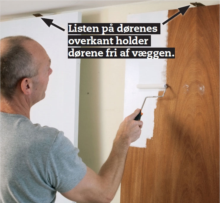 Vask dørene grundigt, mens de sidder på hængslerne. Dørene gøres rene med en blanding af vand og grund-eller malerens. Normalt i forholdet 1:5, men følg vejledningen på emballagen. Skyl efter med rent vand.