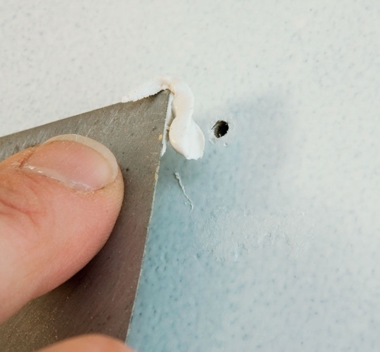 Tryk lidt spartelmasse grundigt ned i alle huller og revner med en stiv spartel. Sørg for, at reparationen er fyldt helt op uden lufthuller. Overskydende masse trækkes af med kanten af spartlen. Større lunker fyldes med en bred spartel.