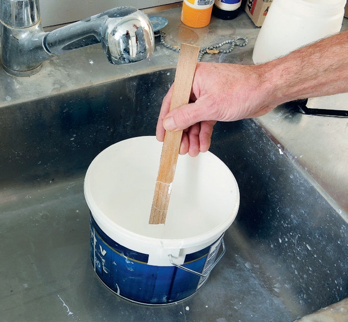 Viskositetsmåleren sænkes ned i malingen og løftes op igen - og så ser du, hvor lang tid det tager for malingen at løbe gennem hullet i bunden. På pistolens papirer kan du se, hvor lang tid det bør tage. Varer det for længe, tilsættes mere vand.