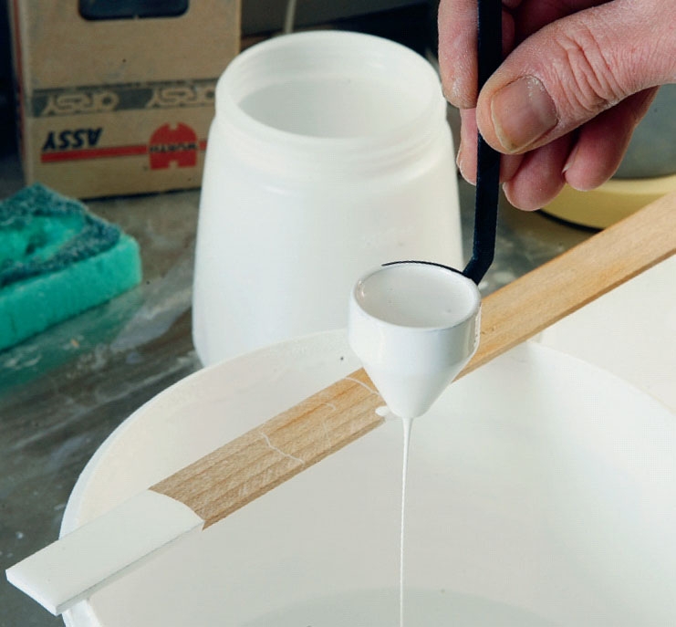 Heldigvis er det ret enkelt at fortynde malingen. Til det bruges en viskositetsmåler, som i al sin enkelhed er en lille “kop” med et hul i bunden og et langt håndtag. Du dypper koppen i din maling og løfter den op og ser, hvor længe malingen er om at løbe ud ad hullet. Tager det for lang tid, skal den være tyndere.