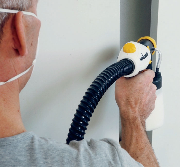 Fladerne sprøjtemales med lange rolige bevægelser. Skift mellem lodrette og vandrette baner for hvert lag. Stop i tide, selv om farven ikke dækker. Begynder malingen at løbe, skal du starte forfra med at slibe.